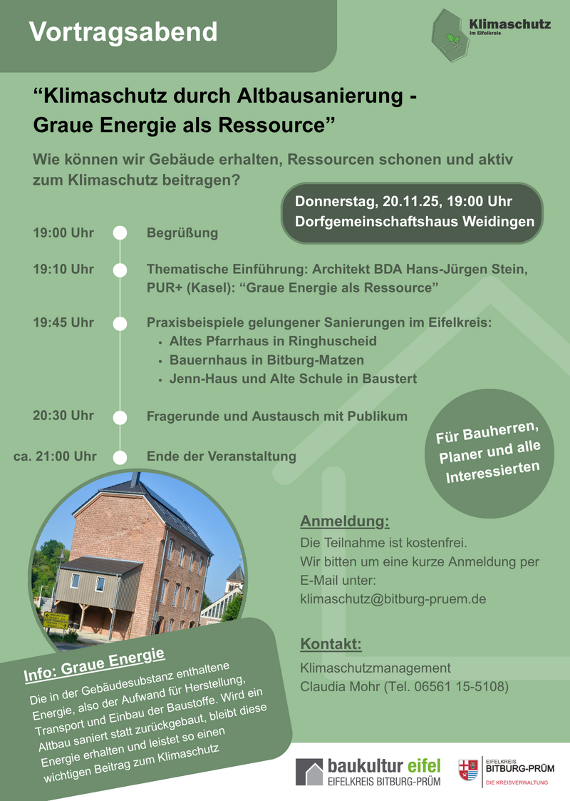 Organisiert wird die Veranstaltung von der Kreisverwaltung des Eifelkreises Bitburg-Prüm – in enger Zusammenarbeit zwischen dem Klimaschutzmanagement und dem Bereich Dorferneuerung. Ziel ist es, privaten Bauherren, Planern und der interessierten Öffentlichkeit praxisnah zu zeigen, welchen hohen Wert die graue Energie im Gebäudebestand für Klimaschutz und Ressourcenschonung hat.